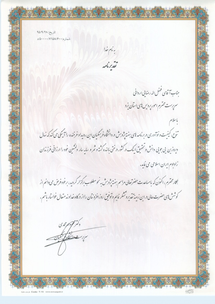 تقدیر از زحمات و تلاش های دکتررضایی در برگزاری مطلوب جشنواره کشوری
