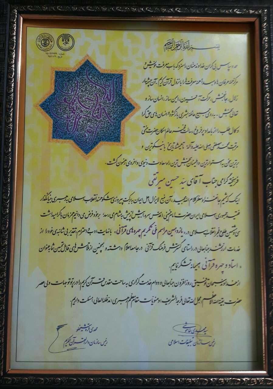 در یازدهمین مراسم ملی تکریم از چهره های قرآنی که در مجموعه فرهنگی شهدای سرچشمه تهران برگزار شد از جناب آقای حسین میرتقی مدرس گروه معارف دانشگاه فرهنگیان یزد، به عنوان استاد و چهره قرآنی کشوری تقدیر و تجلیل به عمل آمد.