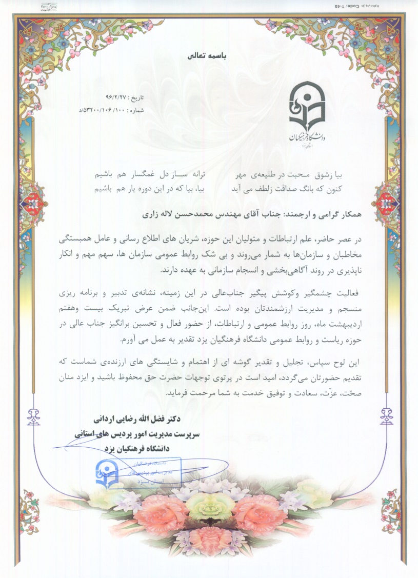 فعالیت چشمگیر وکوشش پیگیر جناب عالی در این زمینه، نشانه ی تدبیر و برنامه ریزی منسجم و مدیریت ارزشمندتان بوده است. این جانب ضمن عرض تبریک بیست وهفتم اردیبهشت ماه، روز روابط عمومی و ارتباطات، از حضور فعال و تحسین برانگیز جناب عالی در حوزه ریاست و روابط عمومی دانشگاه فرهنگیان یزد تقدیر به عمل می آورم.