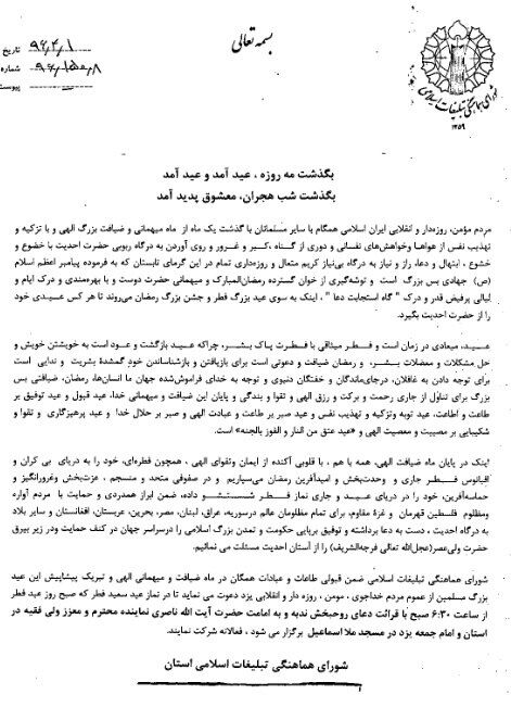 اطلاعیه شورای هماهنگی تبلیغات اسلامی استان یزد در رابطه با عید سعید فطر