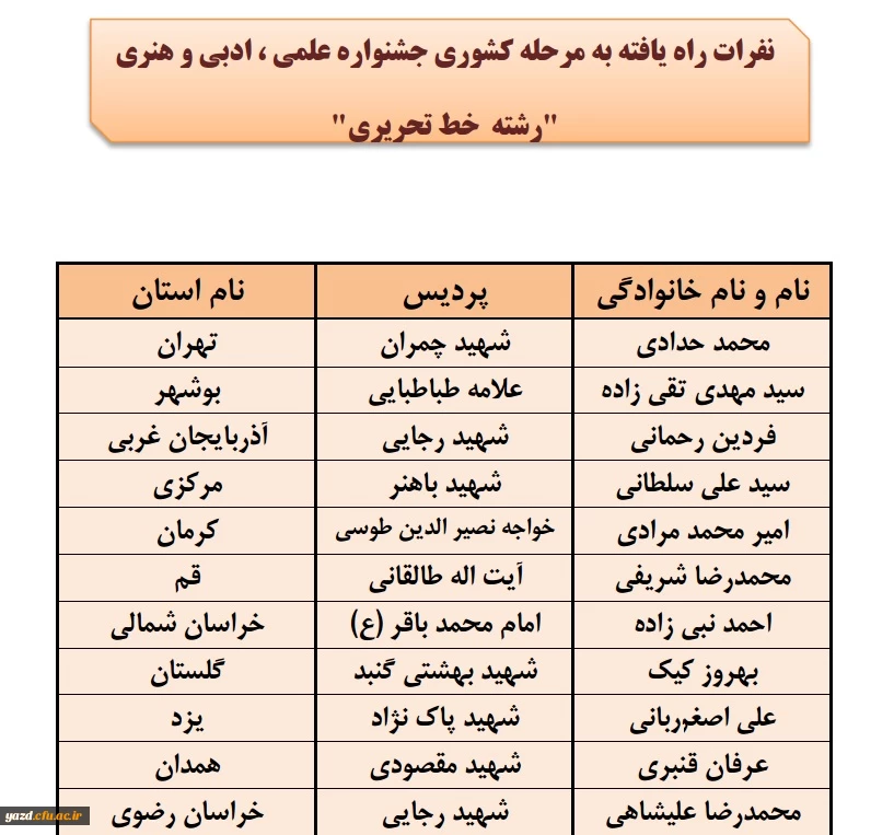 امتیاز دهید : اسامی نفرات راه یافته به مرحله کشوری جشنواره علمی، ادبی وهنری اعلام شد(استان یزد) 4 شنبه 26 تیر 1395 ساعت 9:57