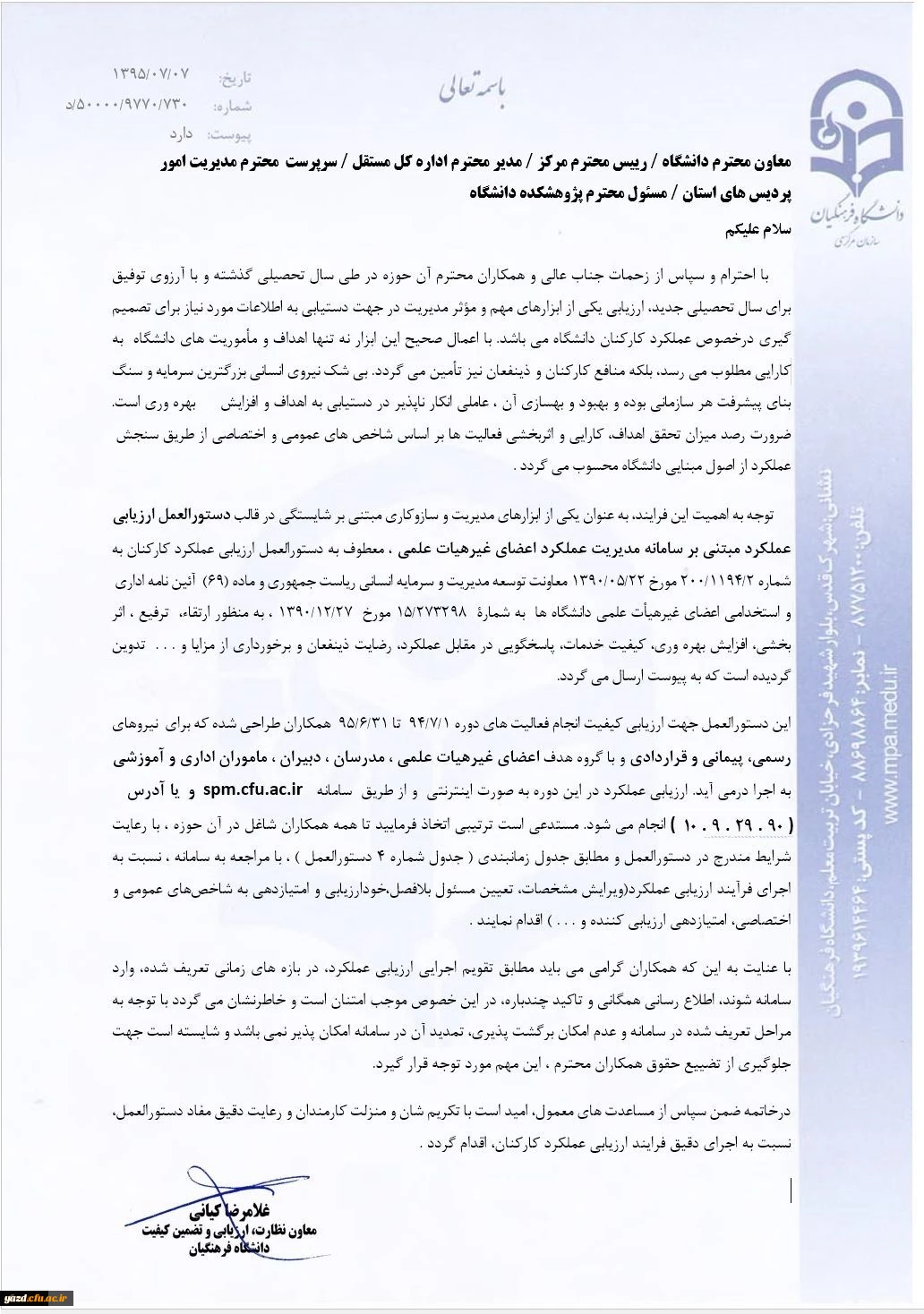 معاونت نظارت، ارزیابی و تضمین کیفیت اعلام کرد: تکمیل فرمهای ارزیابی بر اساس بخشنامه ارزیابی عملکرد کارکنان تا 14 مهر ماه 95 2