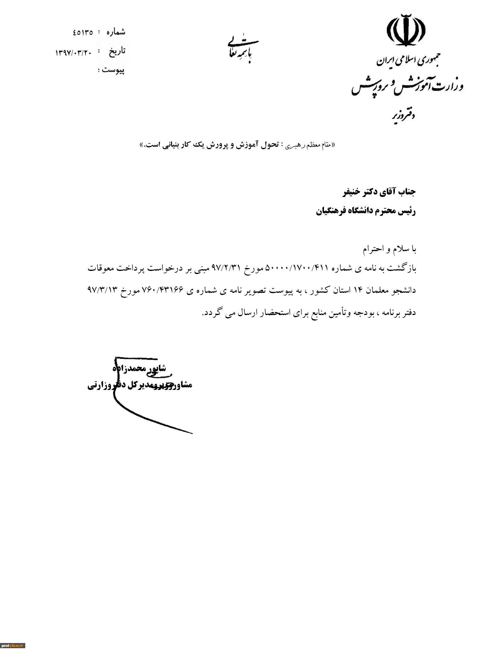 پاسخ مدیر کل دفتر برنامه، بودجه و تامین منابع وزارت آموزش و پرورش در خصوص معوقات دانشجو معلمان (متعهدین خدمت)14 استان کشور 2