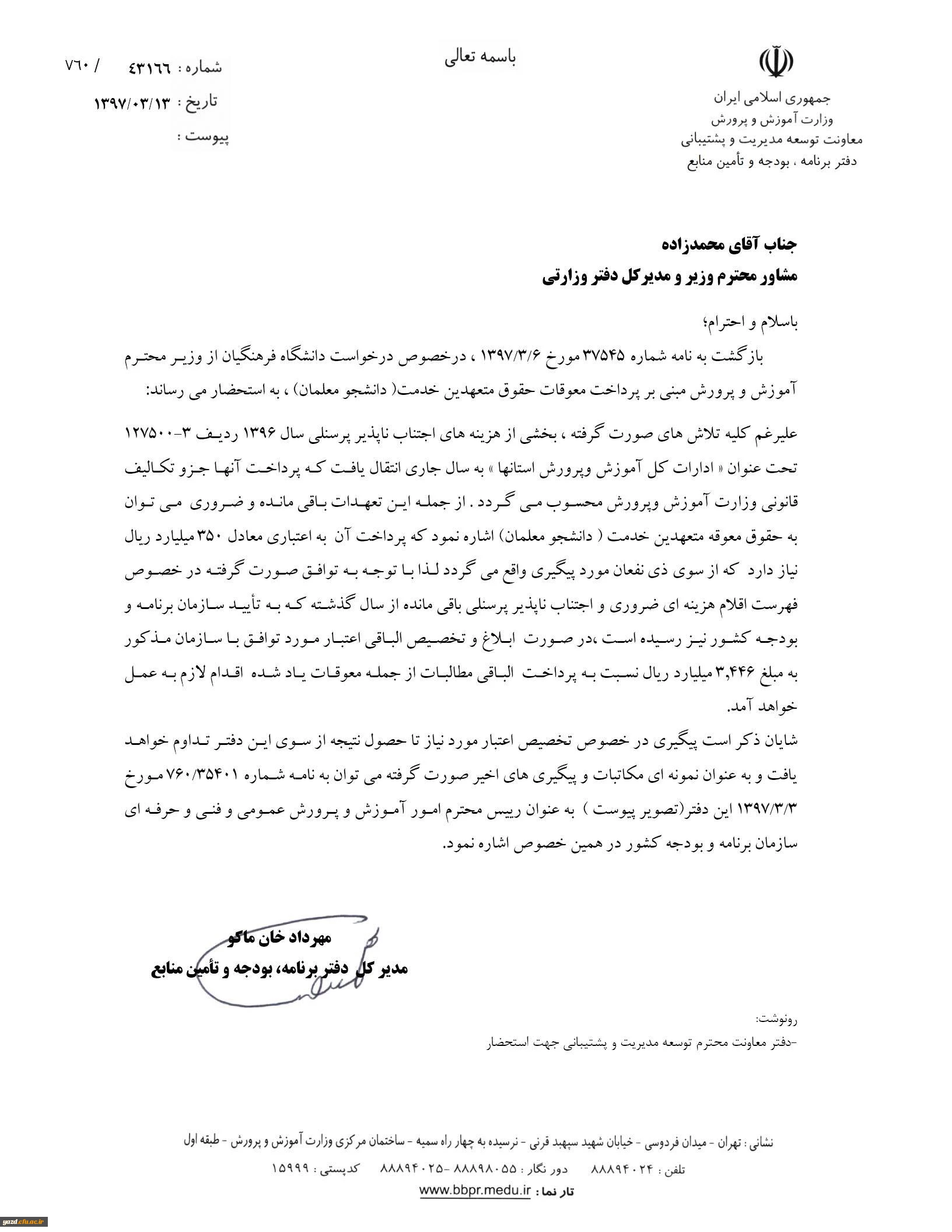 پاسخ مدیر کل دفتر برنامه، بودجه و تامین منابع وزارت آموزش و پرورش در خصوص معوقات دانشجو معلمان (متعهدین خدمت)14 استان کشور 2
