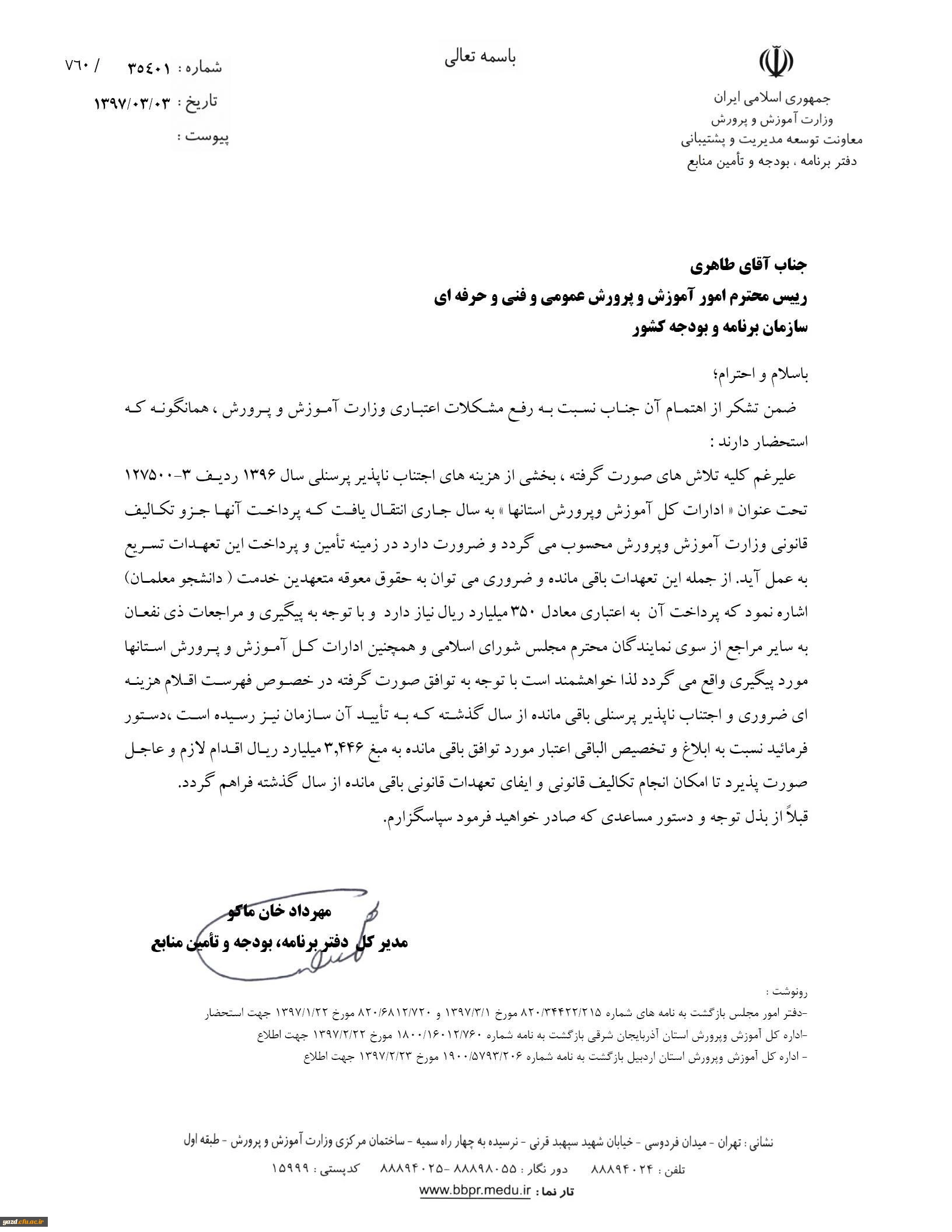 پاسخ مدیر کل دفتر برنامه، بودجه و تامین منابع وزارت آموزش و پرورش در خصوص معوقات دانشجو معلمان (متعهدین خدمت)14 استان کشور 2