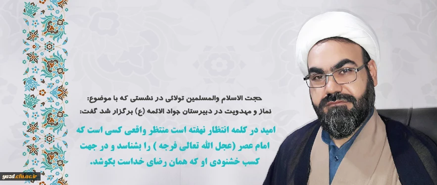 حجت الاسلام والمسلمین تولائی در نشستی که با موضوع نماز و مهدویت در دبیرستان جواد الائمه (ع) برگزارشد گفت: امید در کلمه انتظار نهفته است منتظر واقعی کسی است که امام عصر (عجل الله تعالی فرجه ) را بشناسد و در جهت کسب خشنودی او که همان رضای خداست بکوشد.