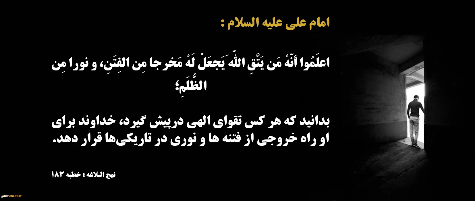 بدانید که هر کس تقواى الهى درپیش گیرد، خداوند براى او راه خروجى از فتنه ها و نورى در تاریکیها قرار دهد.