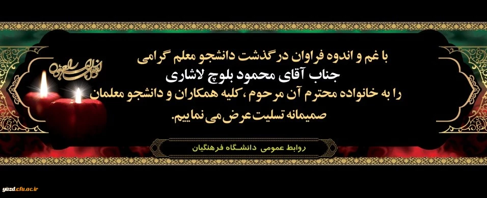درگذشت غم انگیز دانشجو معلم آقای محمود بلوچ لاشاری، دانشجوی کارشناسی پیوسته، رشته مشاوره ورودی 96 را تسلیت عرض می نماییم. 2