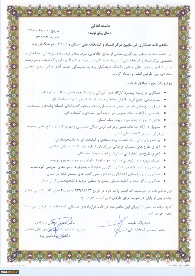 در راستای بهره گیری متقابل از منابع اطلاعاتی، ظرفیت ها و فرصت های پژوهشی، مطالعاتی صورت پذیرفت: انعقاد تفاهم نامه همکاری فی مابین مرکز اسناد و کتابخانه ملی استان و دانشگاه فرهنگیان یزد 8