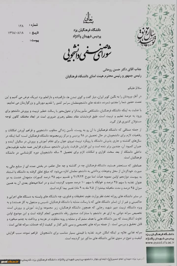 امتیاز دهید : دیدار اعضای شورای صنفی پردیس شهیدان پاک نژاد یزد با رئیس دفتر ریاست جمهوری 3 یکشنبه 19 آبان 1398 ساعت 15:12