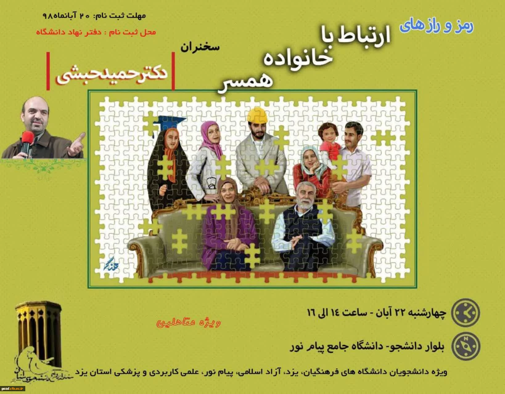 امتیاز دهید : برگزاری نشست رمز و رازهای ارتباط با خانواده همسر با حضور استاد حبشی 2 چهارشنبه 22 آبان 1398 ساعت 9:35