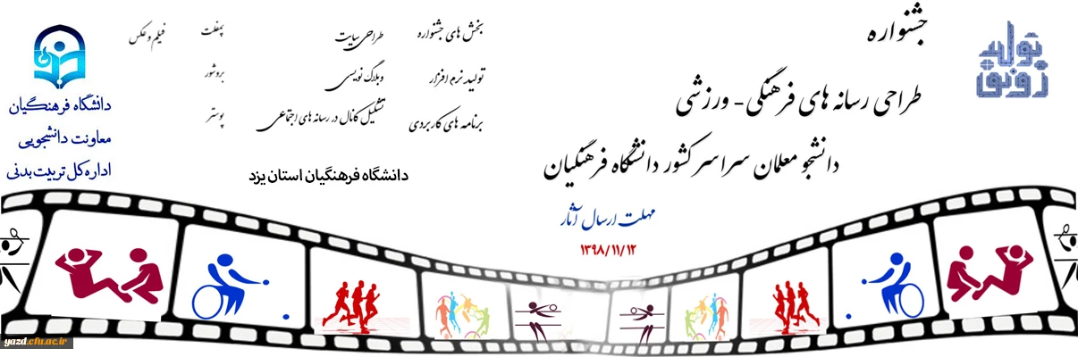 امتیاز دهید : جشنواره طراحی رسانه های فرهنگی – ورزشی دانشجو معلمان سراسر کشور دانشگاه فرهنگیان 4 شنبه 23 آذر 1398 ساعت 8:50