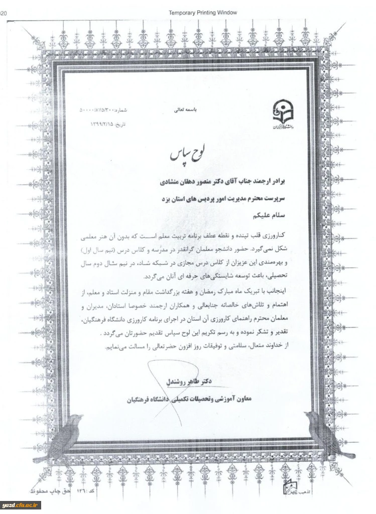 لوح سپاس معاون آموزشی و تحصیلات تکمیلی دانشگاه فرهنگیان به مدیریت امور پردیس های استانی یزد 3