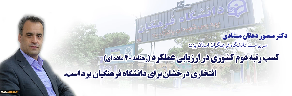 کسب رتبه دوم کشوری در ارزیابی عملکرد (رهنامه 40 ماده ای) افتخاری درخشان برای دانشگاه فرهنگیان یزد است. 2