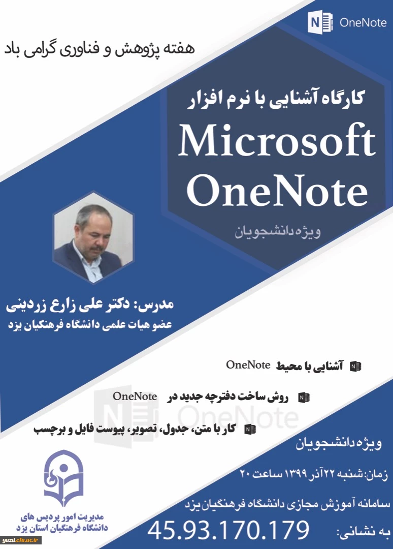 امتیاز دهید : کارگاه آشنایی با نرم افزار OneNote ویژه دانشجویان دانشگاه فرهنگیان یزد 3 یکشنبه 23 آذر 1399 ساعت 12:28