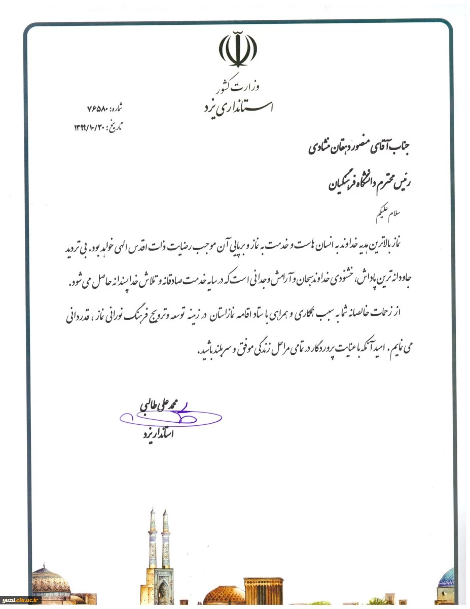 امتیاز دهید : تقدیر استاندار یزد از سرپرست دانشگاه فرهنگیان استان 8 چهارشنبه 20 اسفند 1399 ساعت 15:42