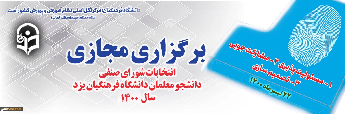 امتیاز دهید : آغاز ثبت نام داوطلبان شرکت در انتخابات شورای صنفی دانشجویی دانشگاه فرهنگیان یزد 4 شنبه 5 تیر 1400 ساعت 14:08