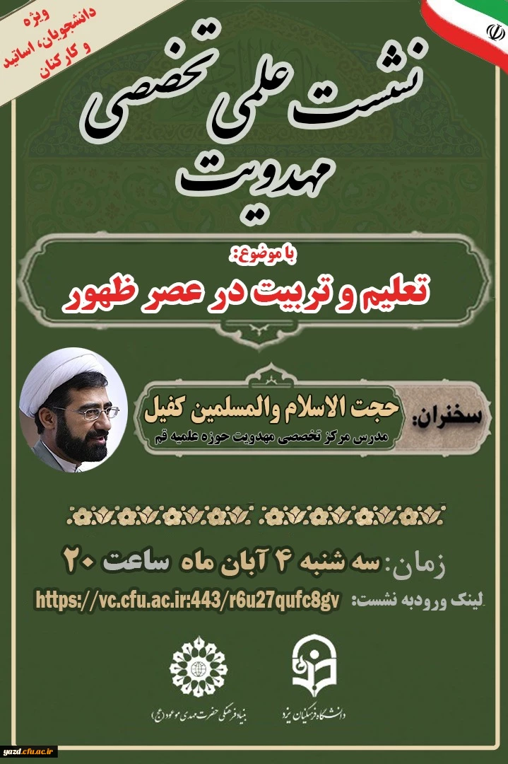 امتیاز دهید : نشست علمی - تخصصی مهدویت با موضوع تعلیم و تربیت در عصر ظهور 3 شنبه 8 آبان 1400 ساعت 14:31