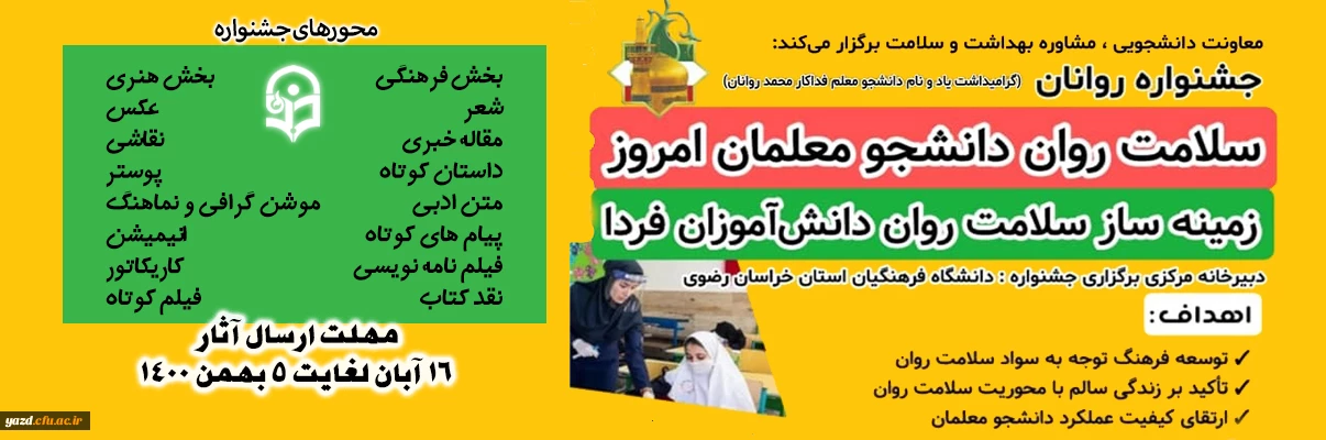 امتیاز دهید : جشنواره سلامت روان دانشجو معلمان امروز، زمینه ساز سلامت روان دانش آموزان فردا 2 چهارشنبه 17 آذر 1400 ساعت 14:01