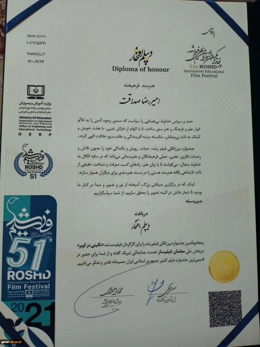 امتیاز دهید : کسب دیپلم افتخار پنجاه و یکمین جشنواره بین المللی فیلم رشد 6 یکشنبه 28 آذر 1400 ساعت 13:42