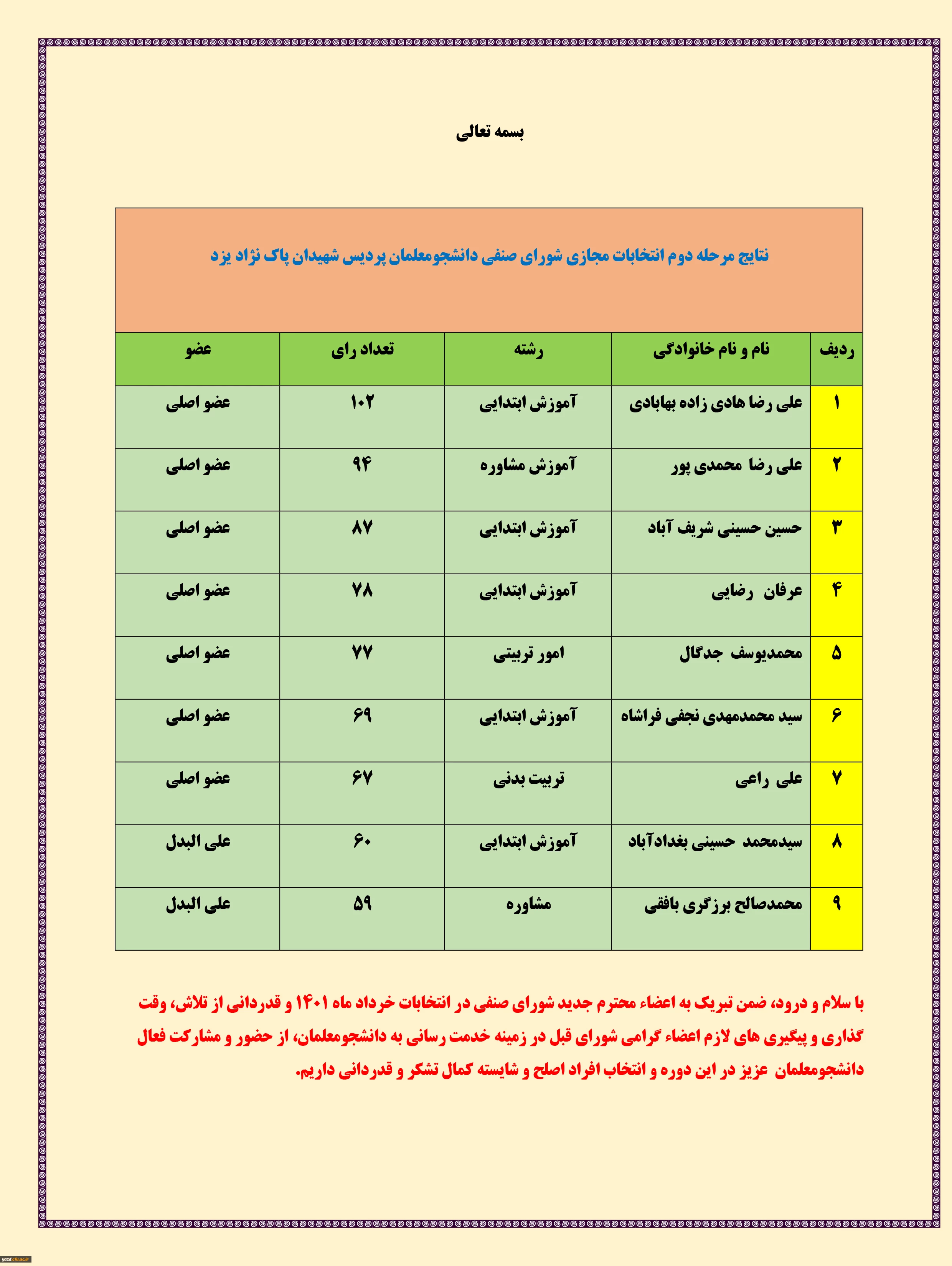 امتیاز دهید : انتخابات شورای صنفی رفاهی دانشجومعلمان دانشگاه فرهنگیان یزد 3 دوشنبه 30 خرداد 1401 ساعت 11:23