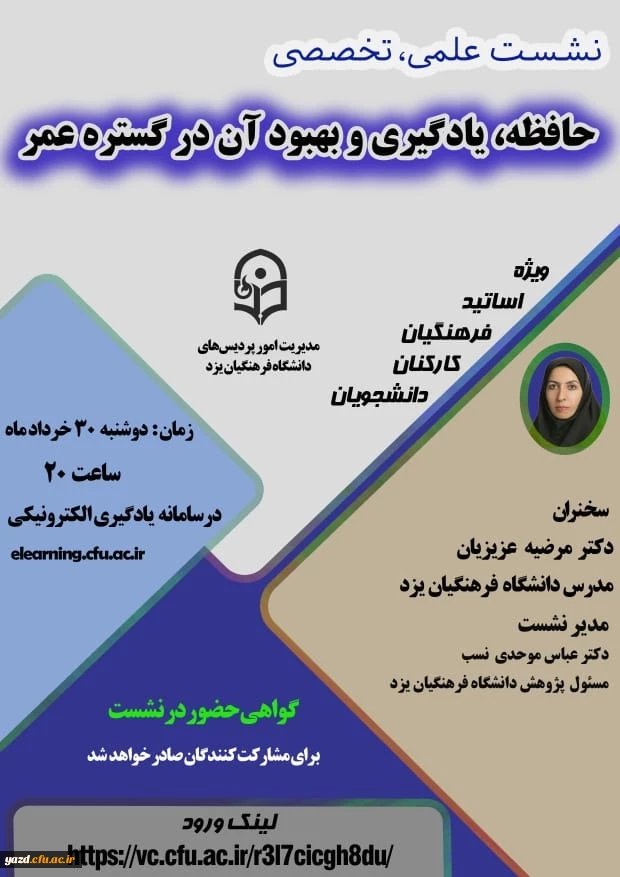 امتیاز دهید : نشست علمی - تخصصی «حافظه، یادگیری و بهبود آن در گستره عمر» 5 چهارشنبه 1 تیر 1401 ساعت 8:31