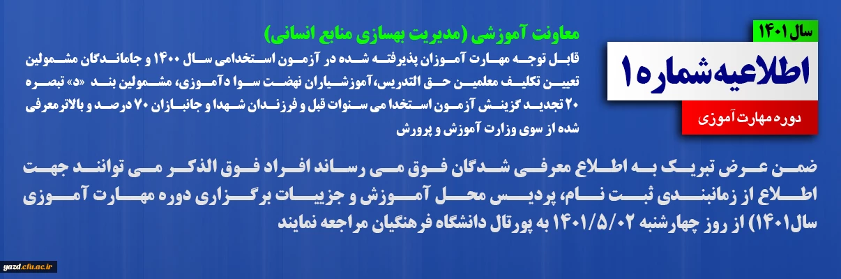 اطلاعیه شماره 1 دوره مهارت آموزی سال 1401 2