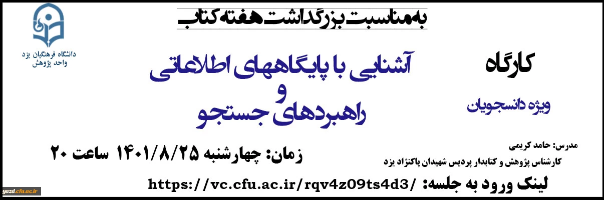 امتیاز دهید : کارگاه آشنایی با پایگاه های اطلاعاتی و راهبردهای جستجو 2 یکشنبه 22 آبان 1401 ساعت 13:01