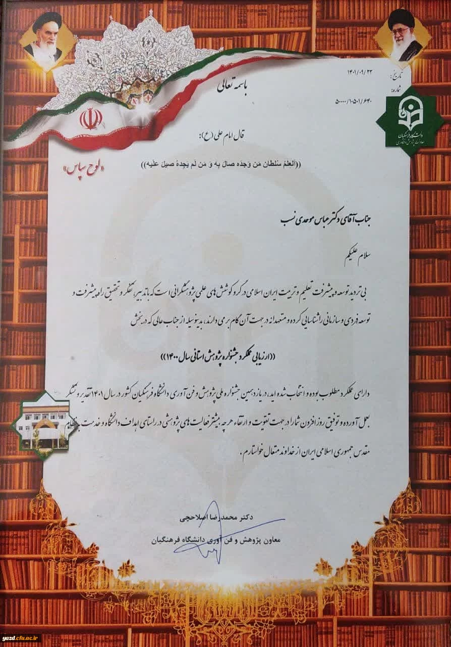 امتیاز دهید : کسب رتبه اول ارزیابی عملکرد در یازدهمین جشنواره ملی پژوهش و فناوری 3 یکشنبه 4 دی 1401 ساعت 10:09