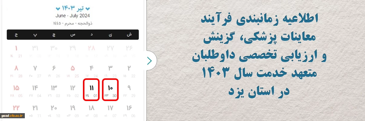 اطلاعیه زمانبندی فرآیند معاینات پزشکی، گزینش و ارزیابی تخصصی داوطلبان متعهد خدمت سال 1403 در استان یزد 2