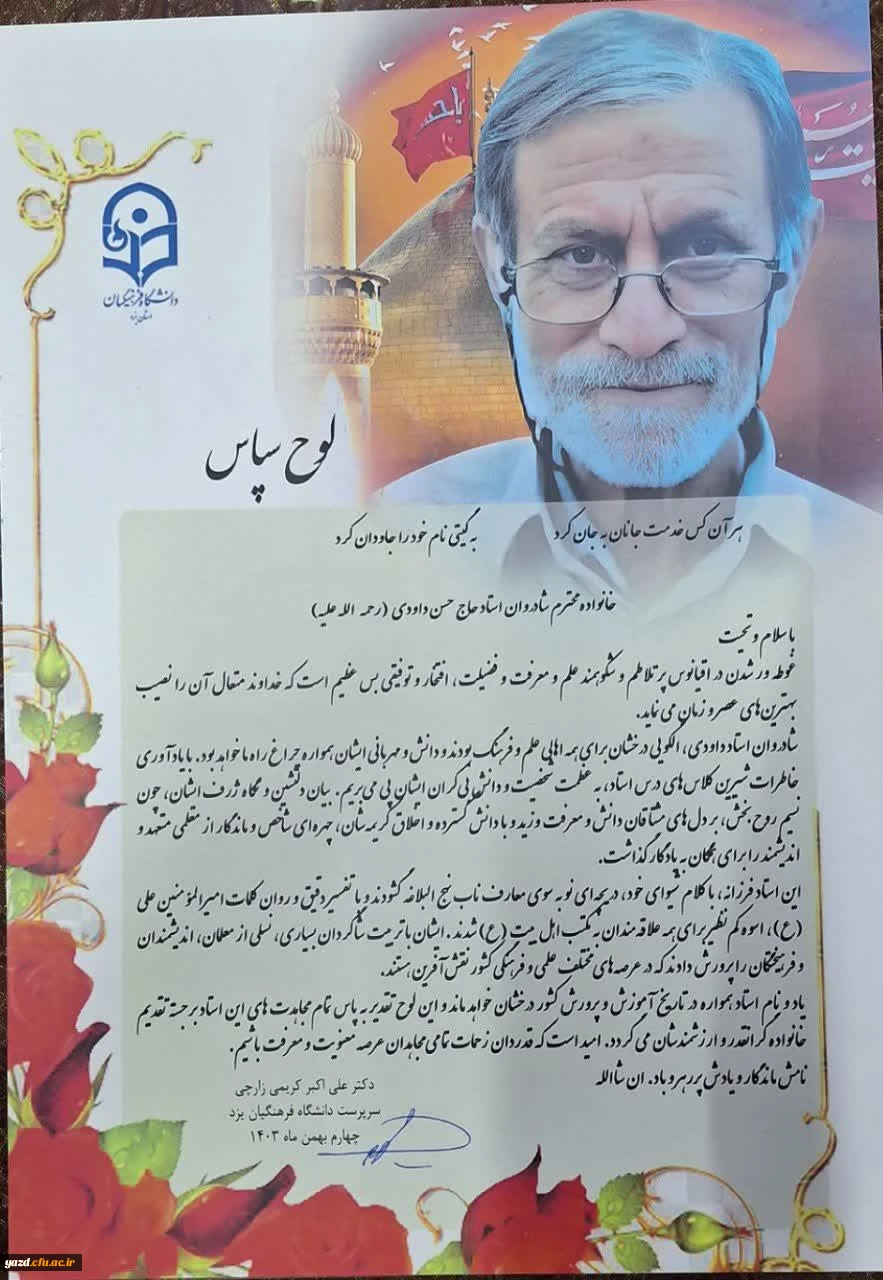 دیدار سرپرست و مدیران دانشگاه فرهنگیان یزد با خانواده فرهیخته و برجسته و پیشکسوت تربیت معلم و آموزش و پرورش شادروان استاد حسن داودی و تقدیر و تجلیل از مجاهدت های ایشان 9