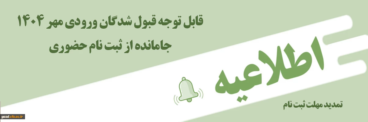 امتیاز دهید : تمدید مهلت ثبت نام قبول شدگان ورودی 1404 جامانده از فرآیند ثبت نام حضوری 2 چهارشنبه 9 مهر 1404 ساعت 13:40